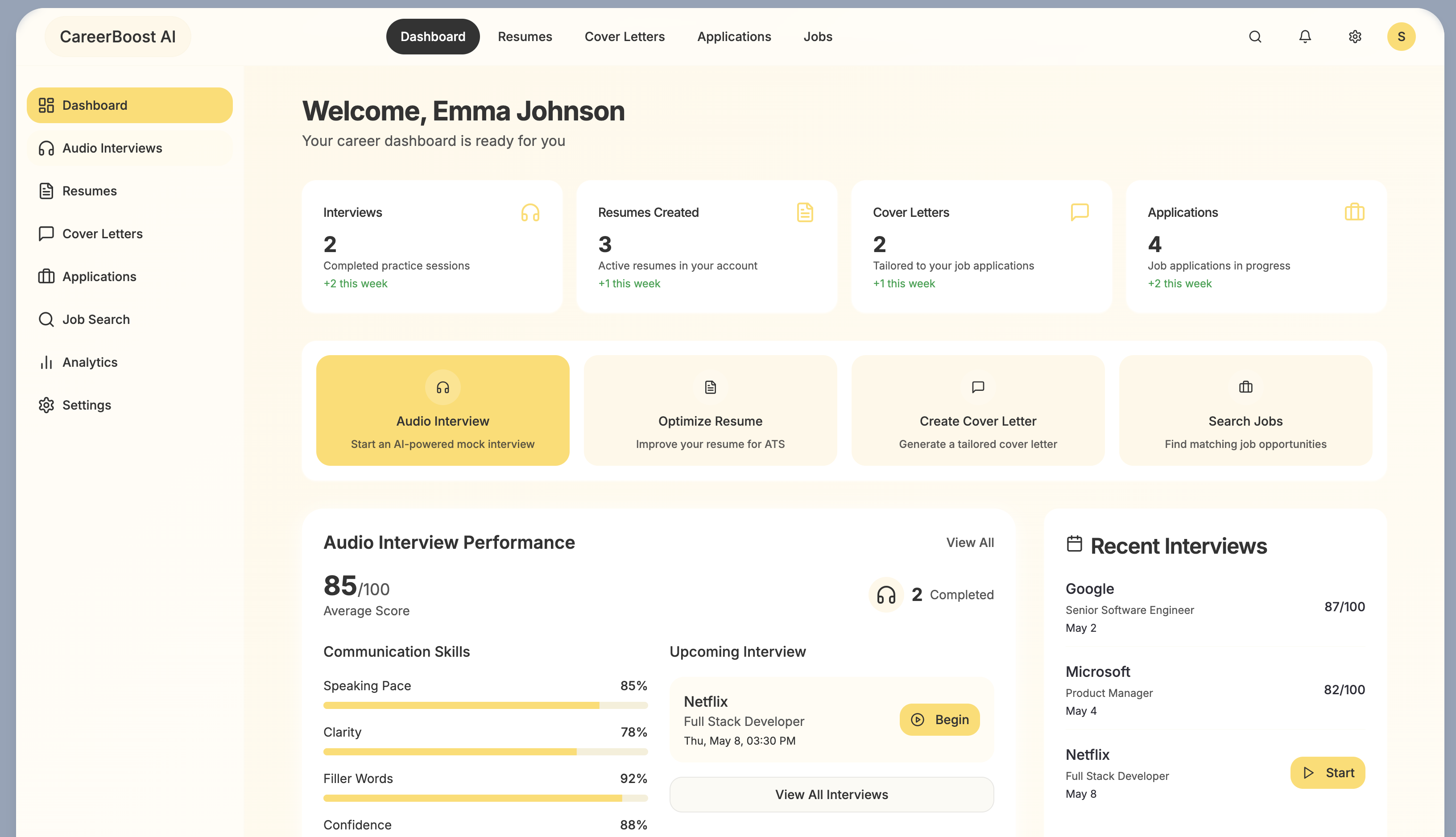 Practice with our intelligent audio interview simulator that provides real-time feedback to help you ace your next job interview.